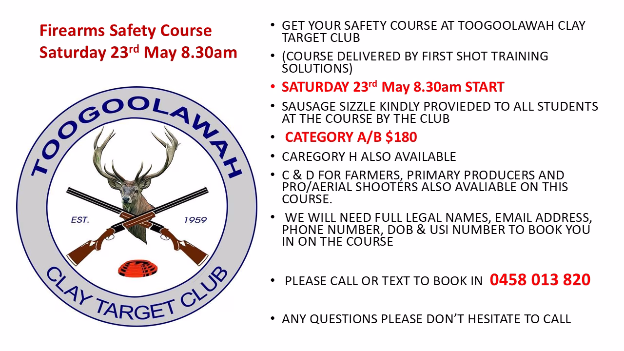 - Category H — Available (Students will do part of the course at Toogloolawah Pistol Club)